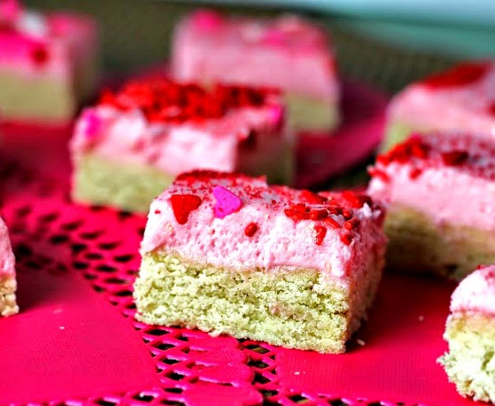 Perfectly, simple, delicious, traditional sugar cookies cut into bars frosted with a cherry buttercream frosting that will knock your socks off!