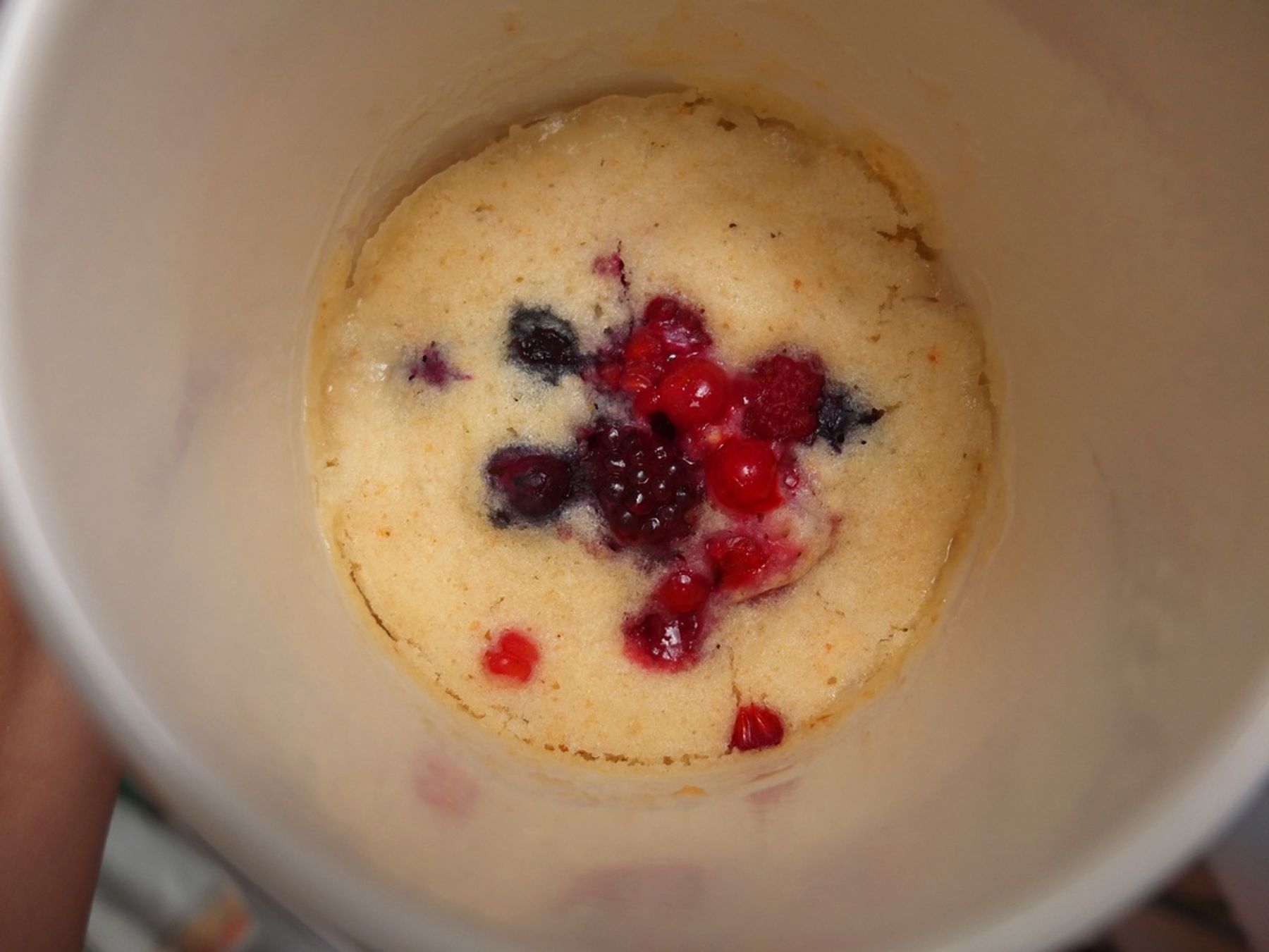 A mug cake is usually something that you do in a mug but that you can also do in a bigger recipient if you’re making 2 or 3 servings (it’s cuter if you do in a single-serving mug). This is a great base recipe for a quick and delicious mug cake. You can change the frozen berries for another ingredient of your choice, just add the same amount.