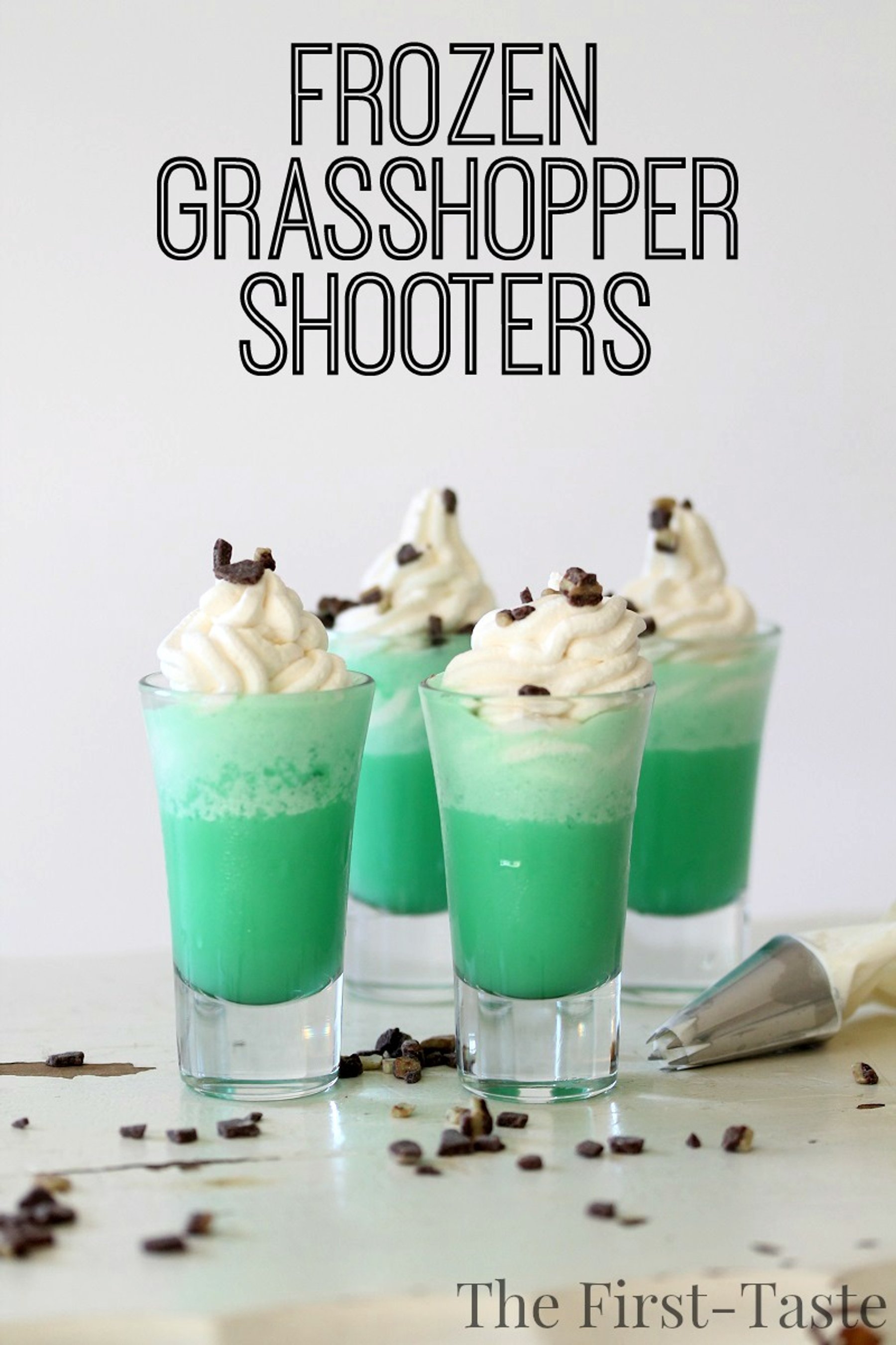 Love grasshopper pie? Then you\\\'ll be over the rainbow with these easy and delicious Frozen Grasshopper Shooters! Topped with whipped cream, these are sweet!