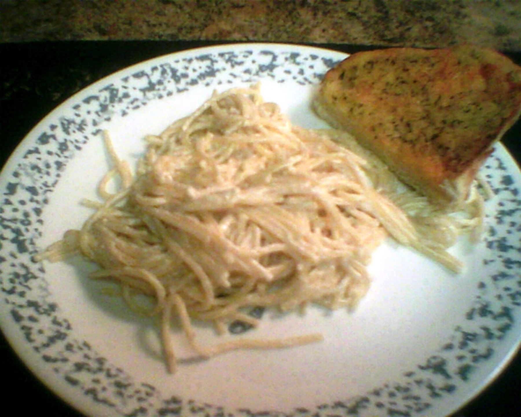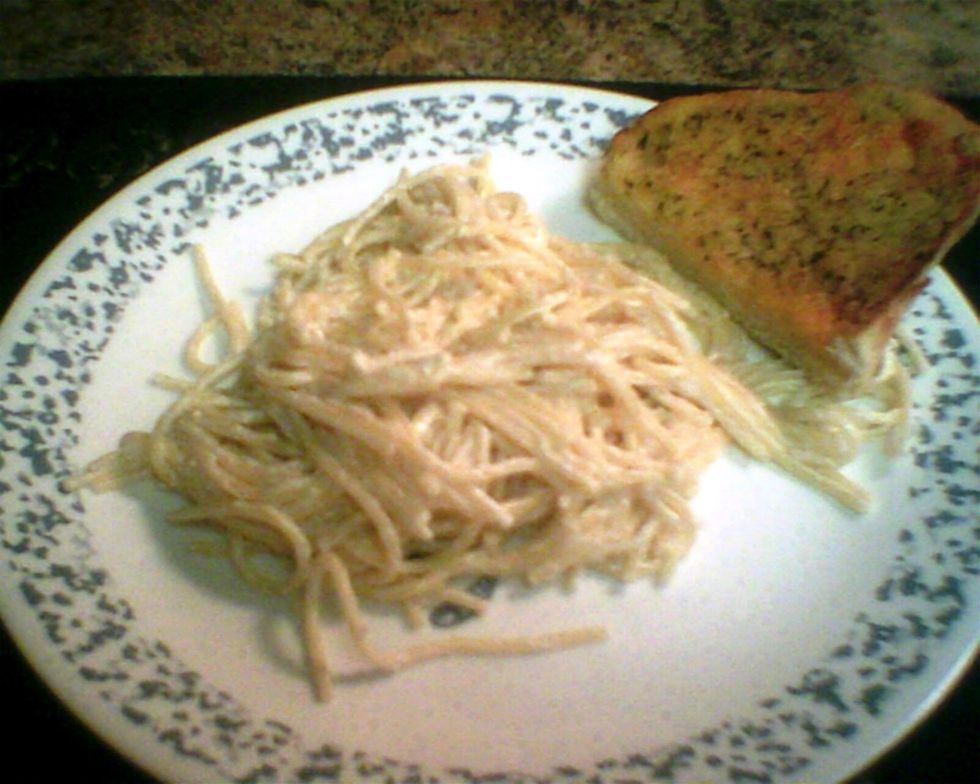 Cook spaghetti according to directions. While that's cooking saute garlic in 1 tablespoon of butter until done. Then add all the other spices and creams except parsley to the mix heat up do not let it...