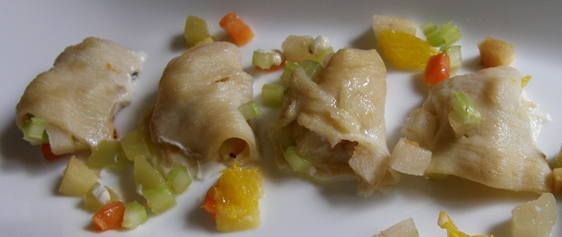 Scoop a little fruit mixture on each chicken slice, roll up, and put on the baking dish. Leave 1 inch between the rolls.