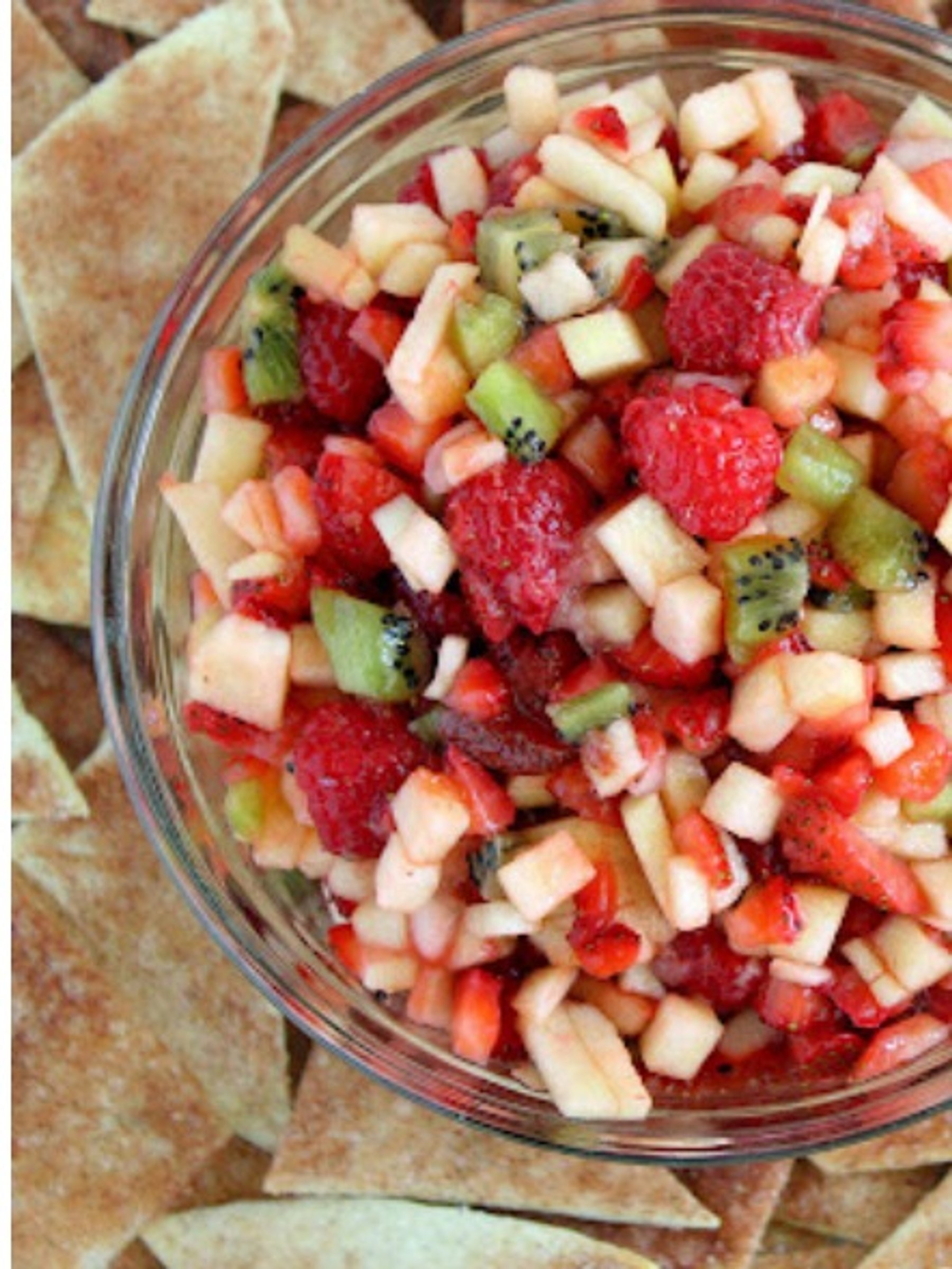 Tasty fruit salsa and cinnamon tortilla chips! Easy to make, and great as an appetizer or snack.
