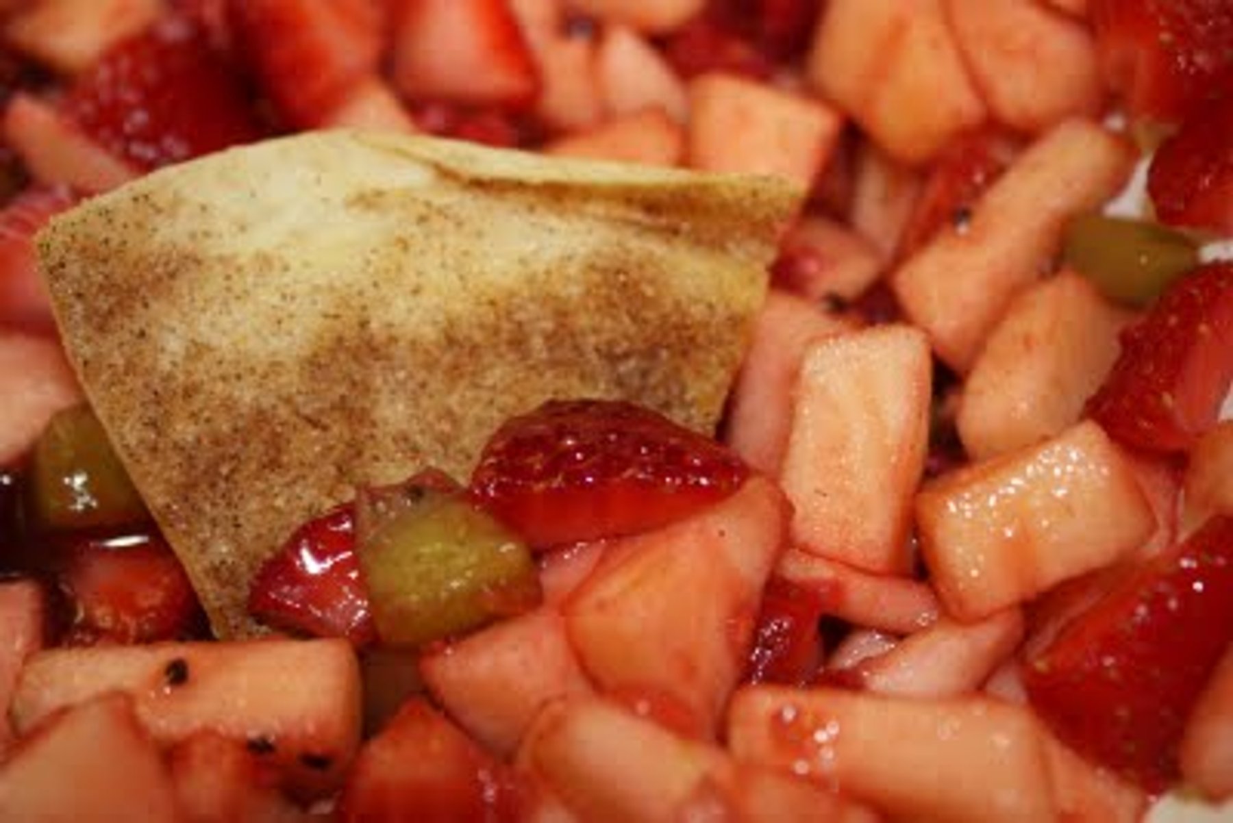 In a large bowl, mix all the fruit, sugars and fruit preserves thoroughly and chill for at least 15 minutes. Preheat oven to 350 degrees. Coat one side of each tortilla with butter or cooking spray....