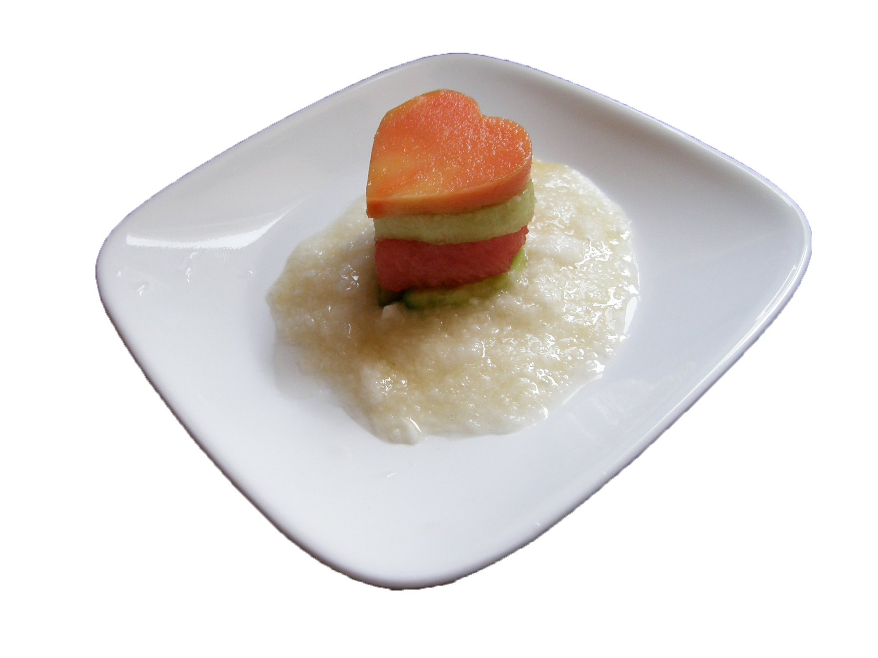Stack up different fruits to make a fruit salad that looks like a veggie dessert. This is easy and looks great!