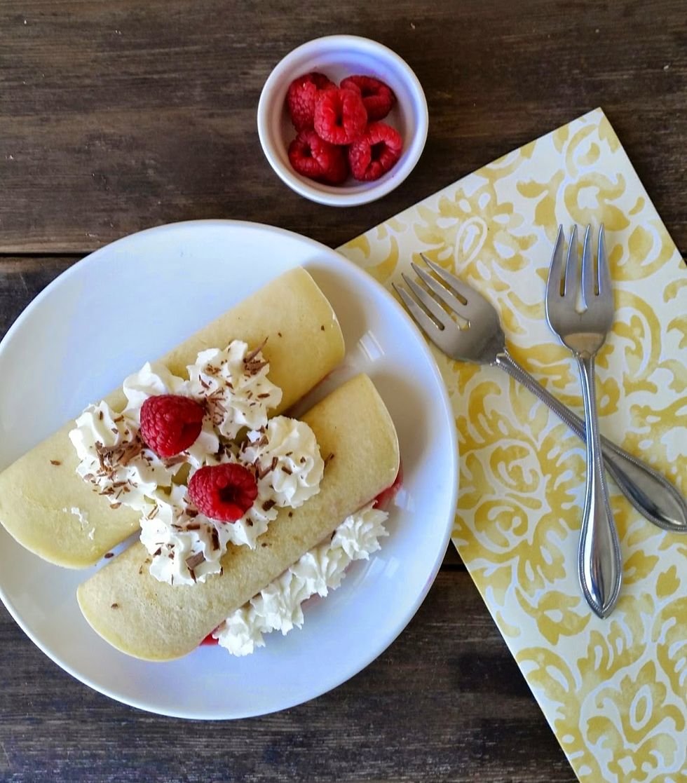 I have some unexpected down time and in the quieter moments I love to create recipes for my family to enjoy! These easy to make fruit and yogurt crepes are a thin crepe, thick creamy yogurt filling, raspberry sauce, and topped with silky whipped cream!