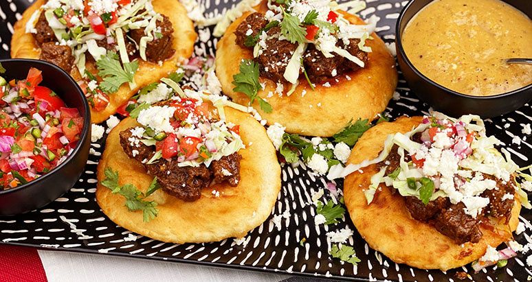 If you're looking for delicious tacos, stop here! The crispy fry bread is topped with braised hatch chile Wagyu beef, salsa cruda, hatch chile salsa, shredded cabbage, and crumbled queso fresco. Each bite results in a burst of flavor, leaving any taco connoisseur thoroughly impressed! Try this recipe on Taco Tuesday or any day of the week!