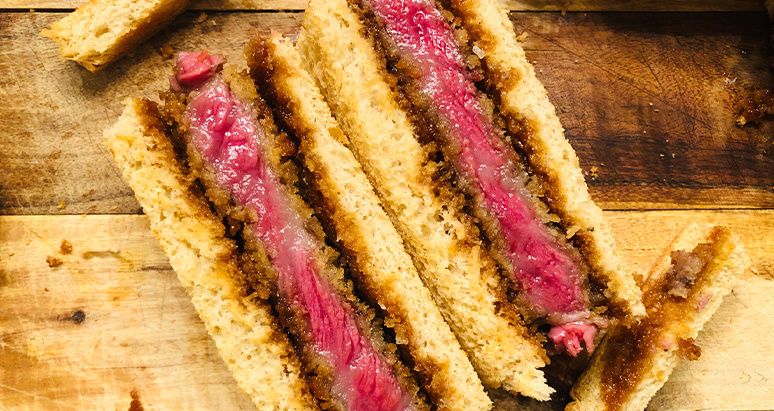 Tender Fullblood Wagyu steak is floured and coated with panko bread crumbs before being fried. The sauce, which includes sake, honey, and oyster sauce, is drizzled on the breaded beef. The hearty sandwich is finished by placing the steak between two slices of toasted white bread! Try this recipe for lunch or happy hour!