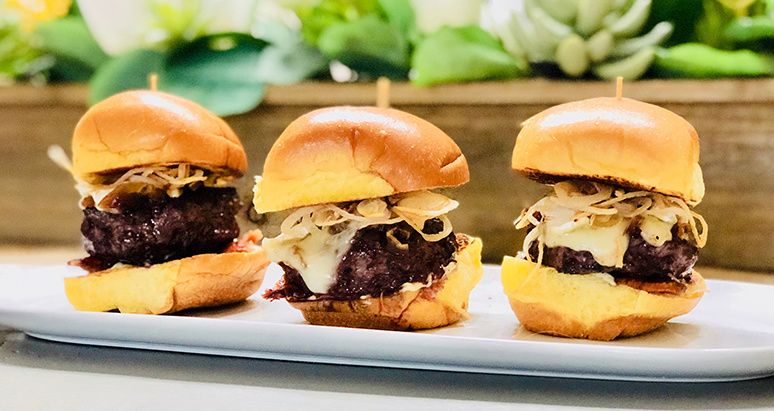 Fullblood Wagyu Beef Sliders with dijon mayo, brie, dates, bacon, and fried shallots.