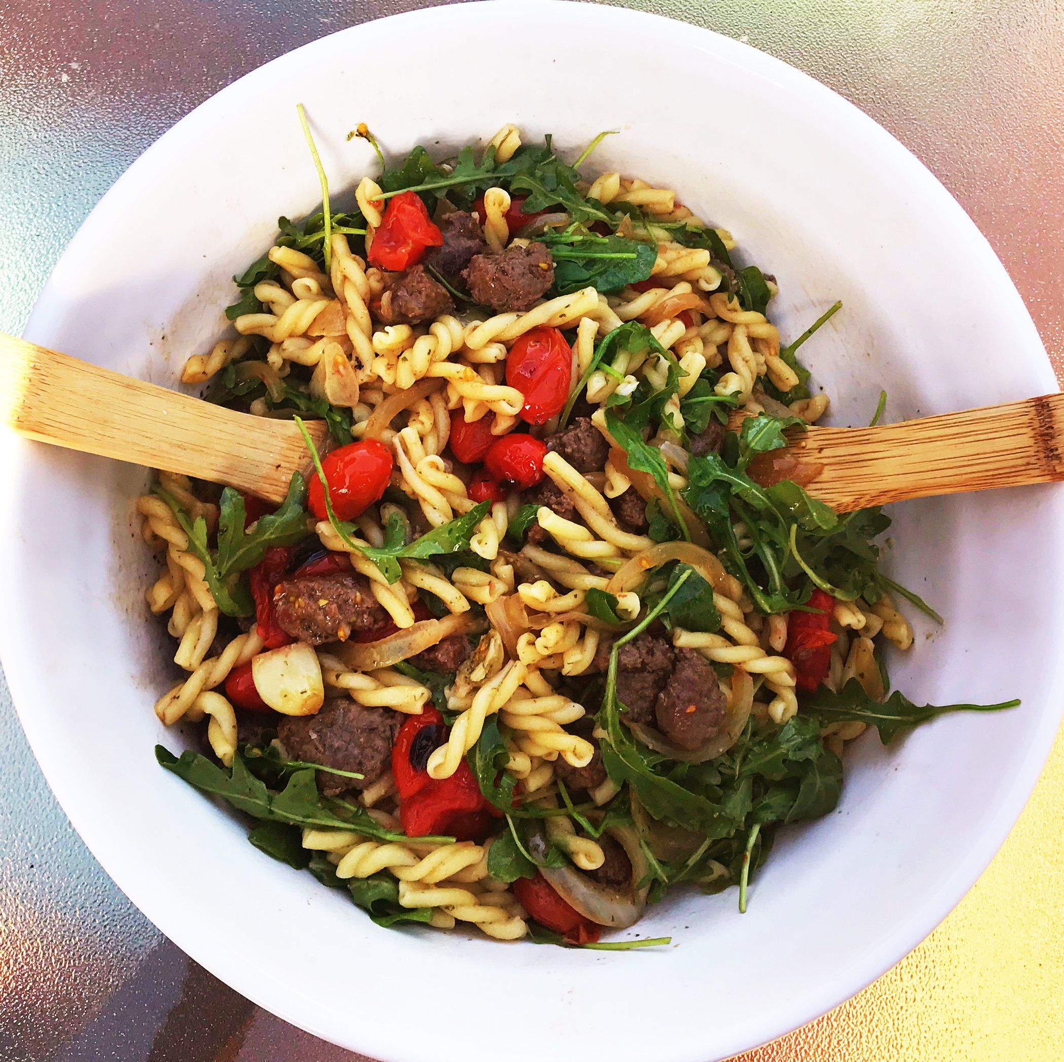 A delicious, Fullblood Wagyu Sweet Italian Sausage Pasta recipe, served with roasted tomatoes, caramelized onions, fresh arugula, and topped with a roasted garlic basil oil.