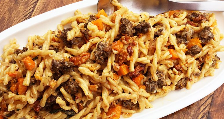 Fullblood Wagyu Sweet Italian Sausage Pasta with roasted butternut squash and walnuts.