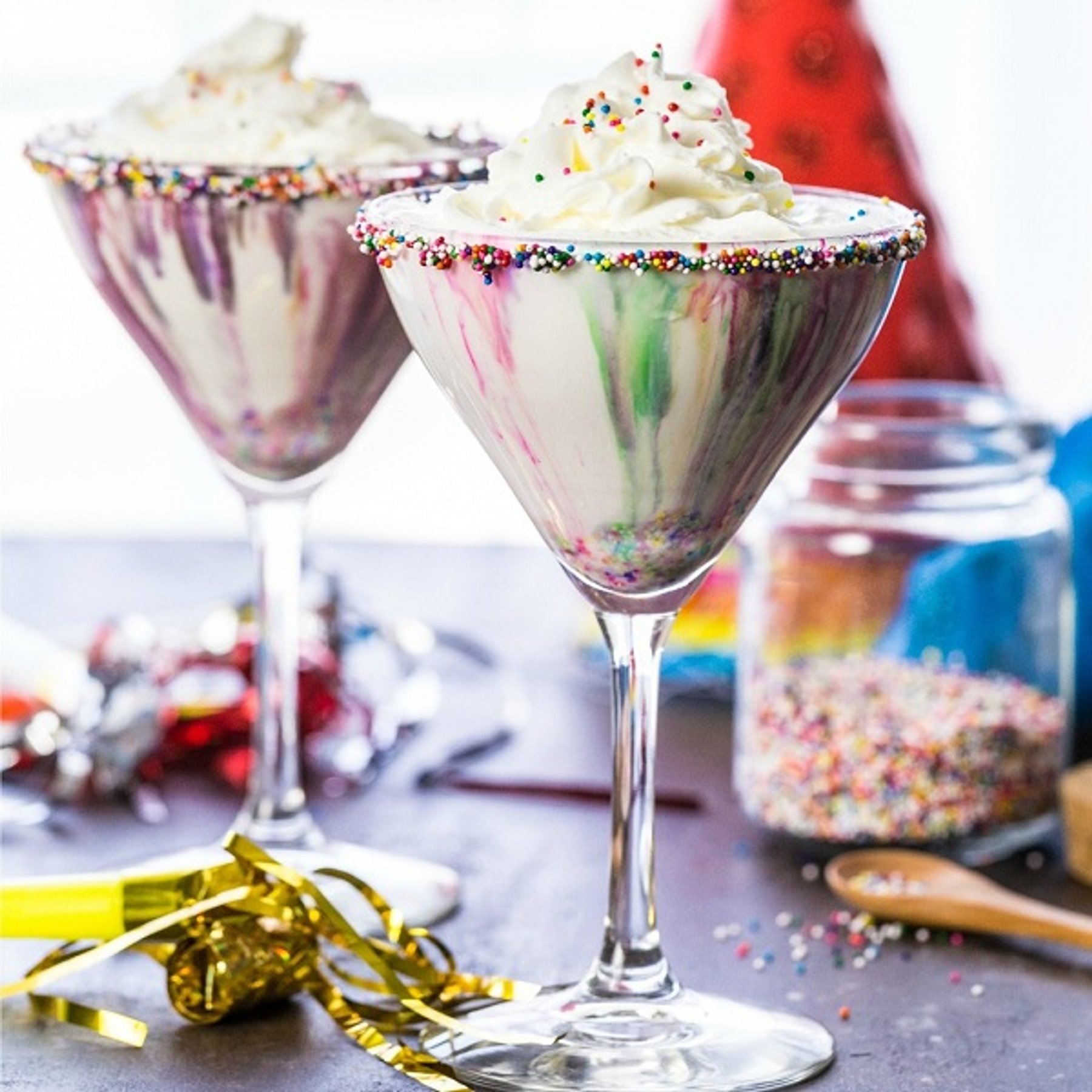 1. Dip the top of each martini glass in water and then dip in sprinkles to coat the rim. Sprinkle a small amount of sprinkles into the bottom of each glass.