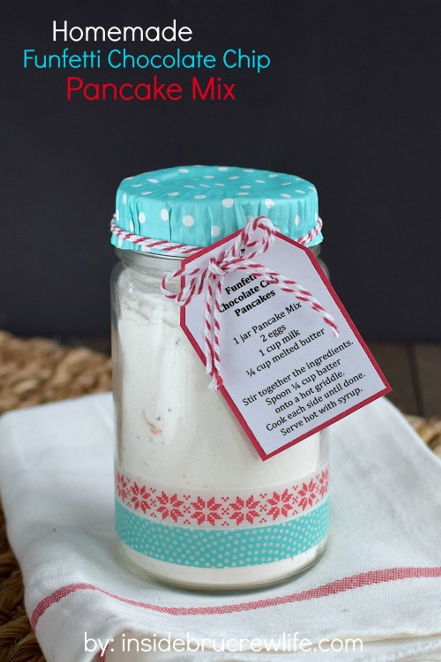 Easy homemade pancake mix with sprinkles and chocolate chips is a fun breakfast. Perfect for packaging and giving as gifts too.