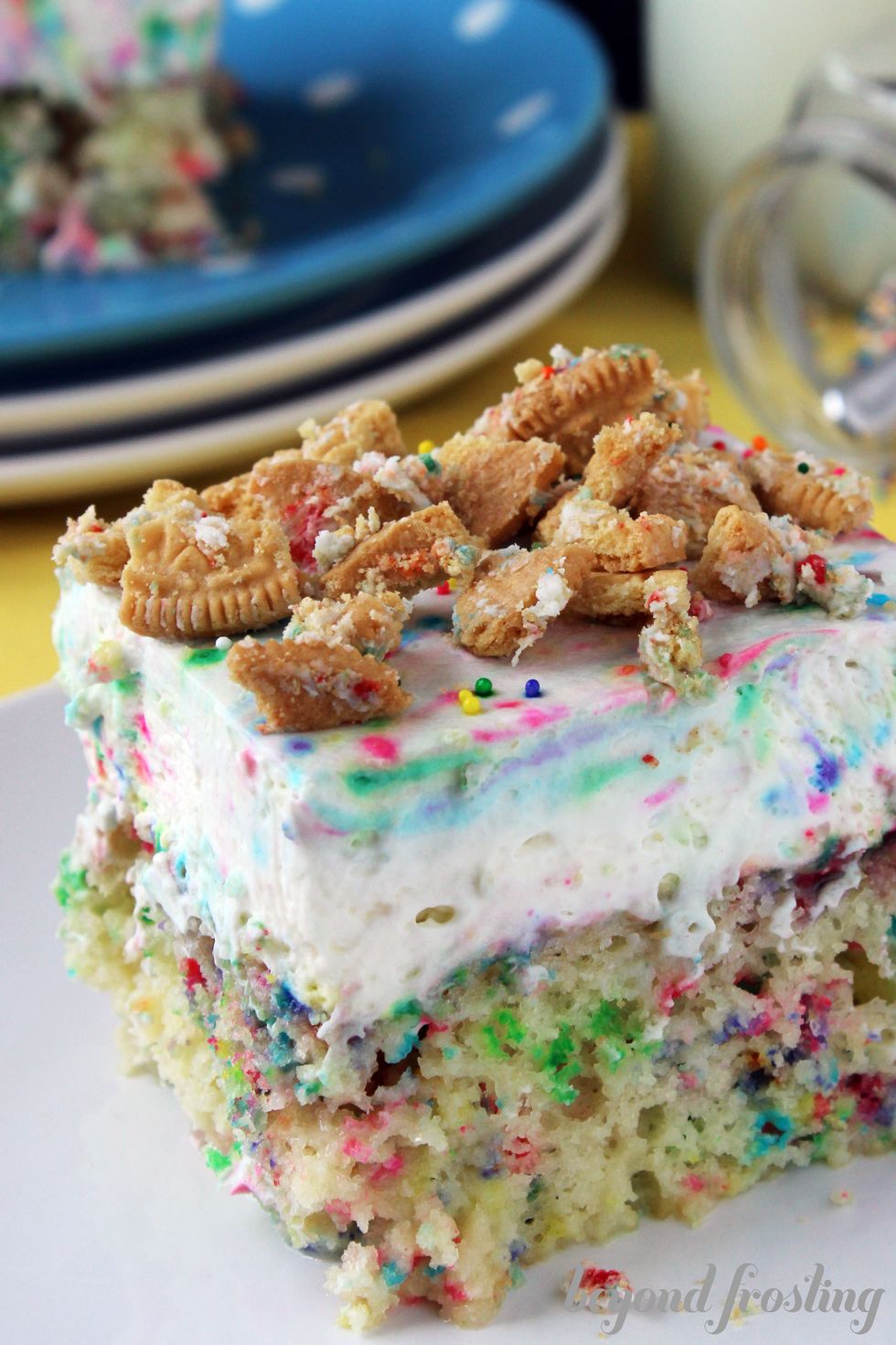 Funfetti cake with sweetened condensed milk and cake batter whipped cream. Topped with birthday cake Oreos.