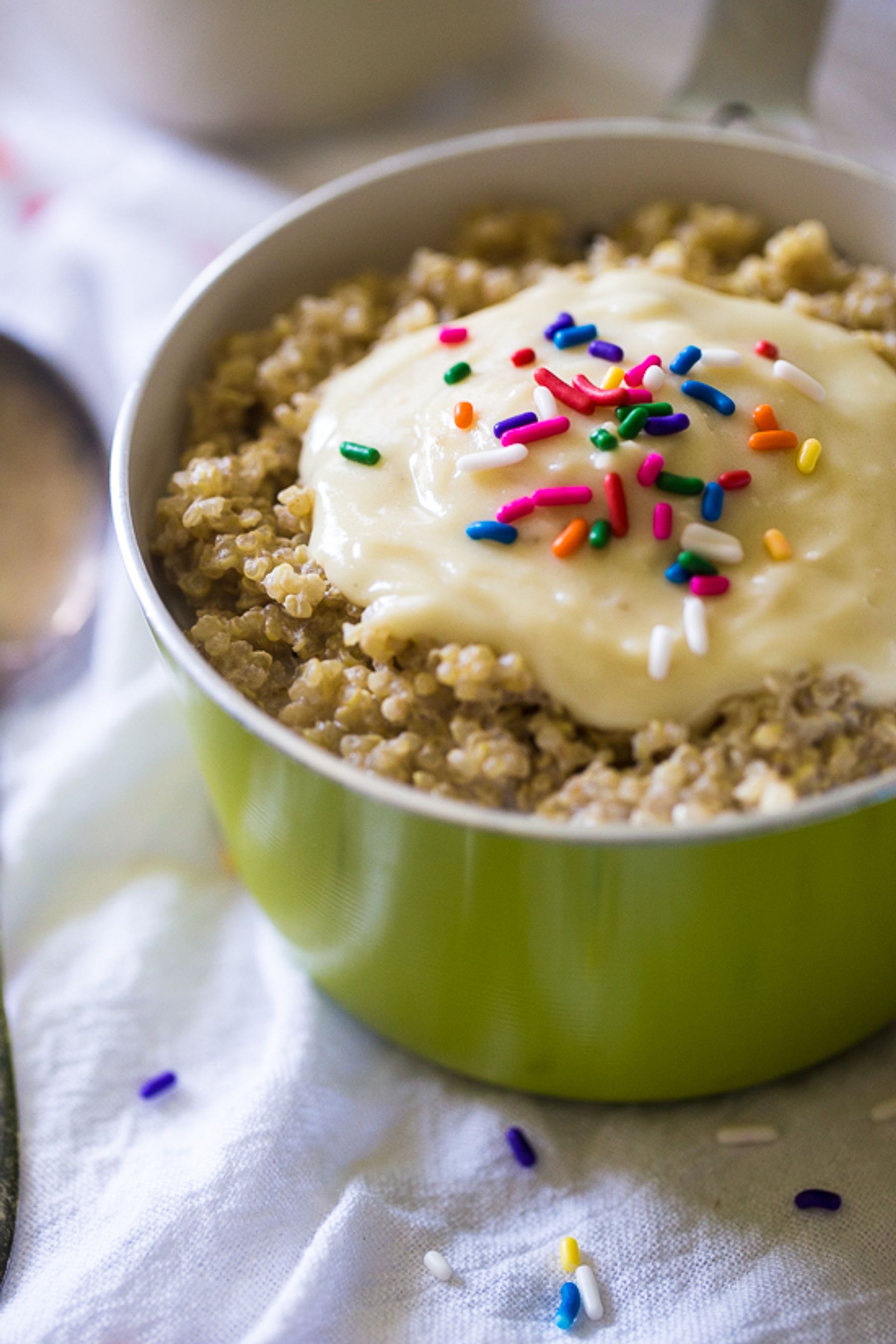 This breakfast quinoa is quick, easy and tastes like a bowl of Funfetti cake! The protein powder swirl makes it extra creamy AND healthy! It's ready in only 25 minutes and has 5 ingredients, so you can have cake for breakfast everyday!
