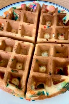 Waffles with sprinkles added for a special breakfast, perfect for a birthday.