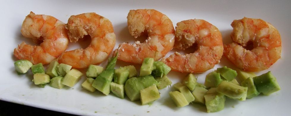 Cut the avocado into small pieces and put next to the shrimp. Hot shrimp goes really well with cool avocado.