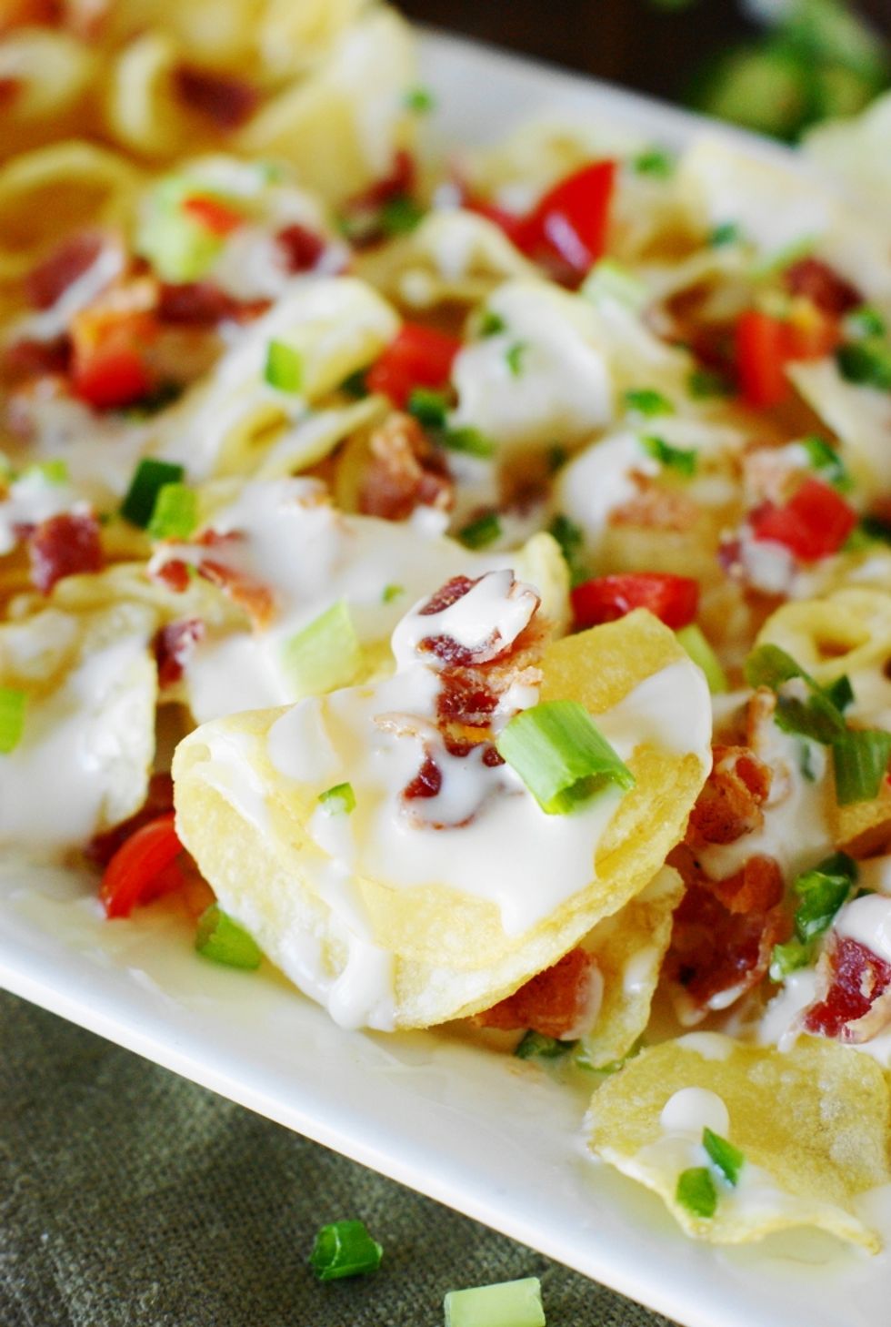 Game Day Pub Chips ~ loaded with crumbled bacon and other goodies, all drizzled with beer-laced queso. They\\\'re a platter of pure potato chip deliciousness!