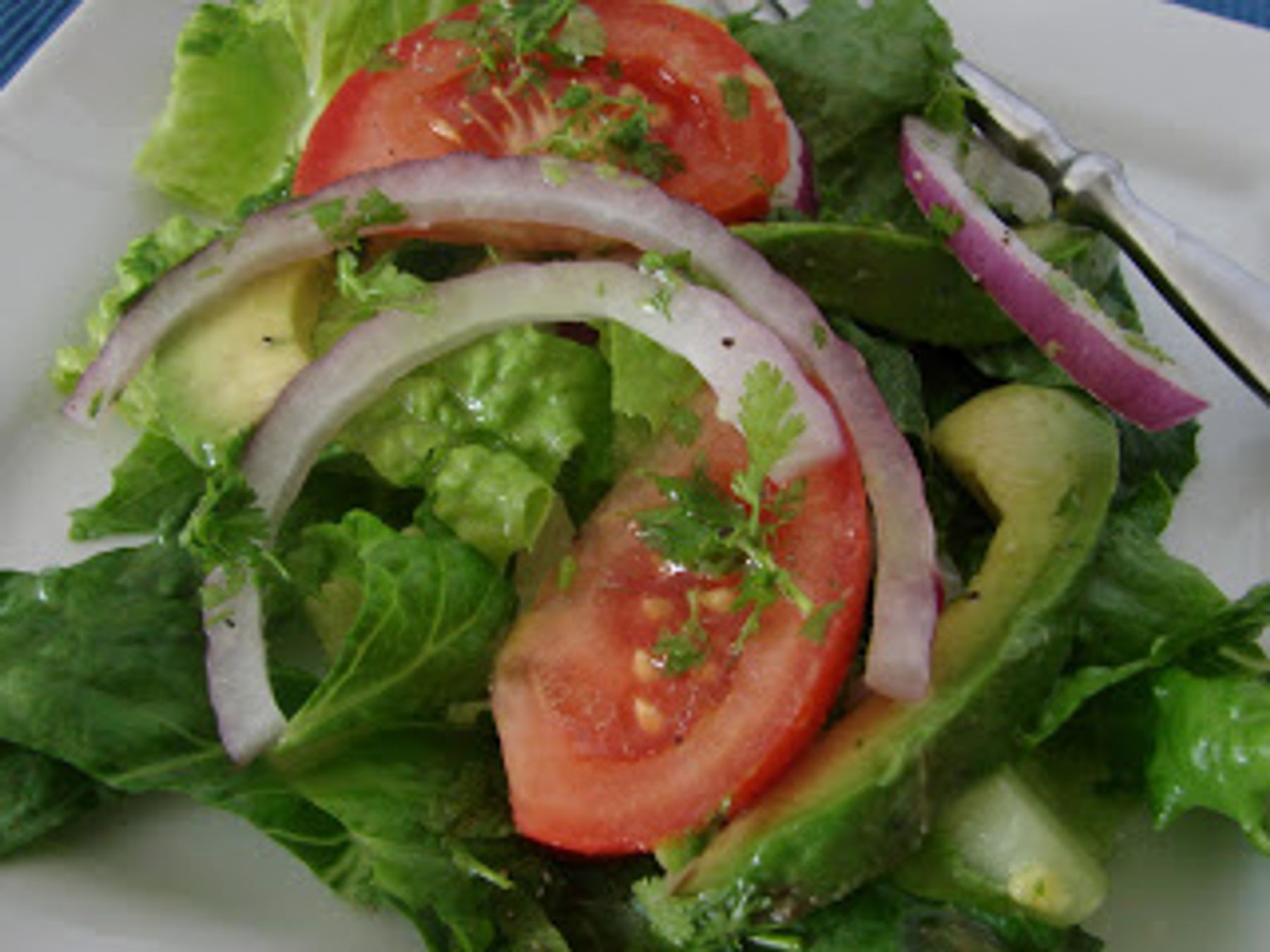 To make the dressing, combine cilantro, lime juice, olive oil, salt and pepper in a small bowl and whisk to combine. In a large bowl, place lettuce and top with onion, tomatoes and avocado. Drizzle with...
