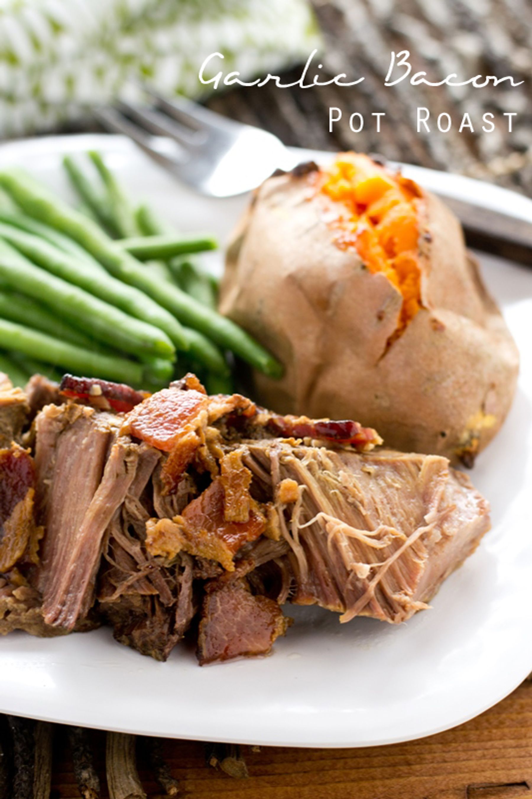 Let the slow cooker do all the work for this paleo Garlic Bacon Pot Roast. Just 4 ingredients make this a deliciously savory, healthy comfort meal.