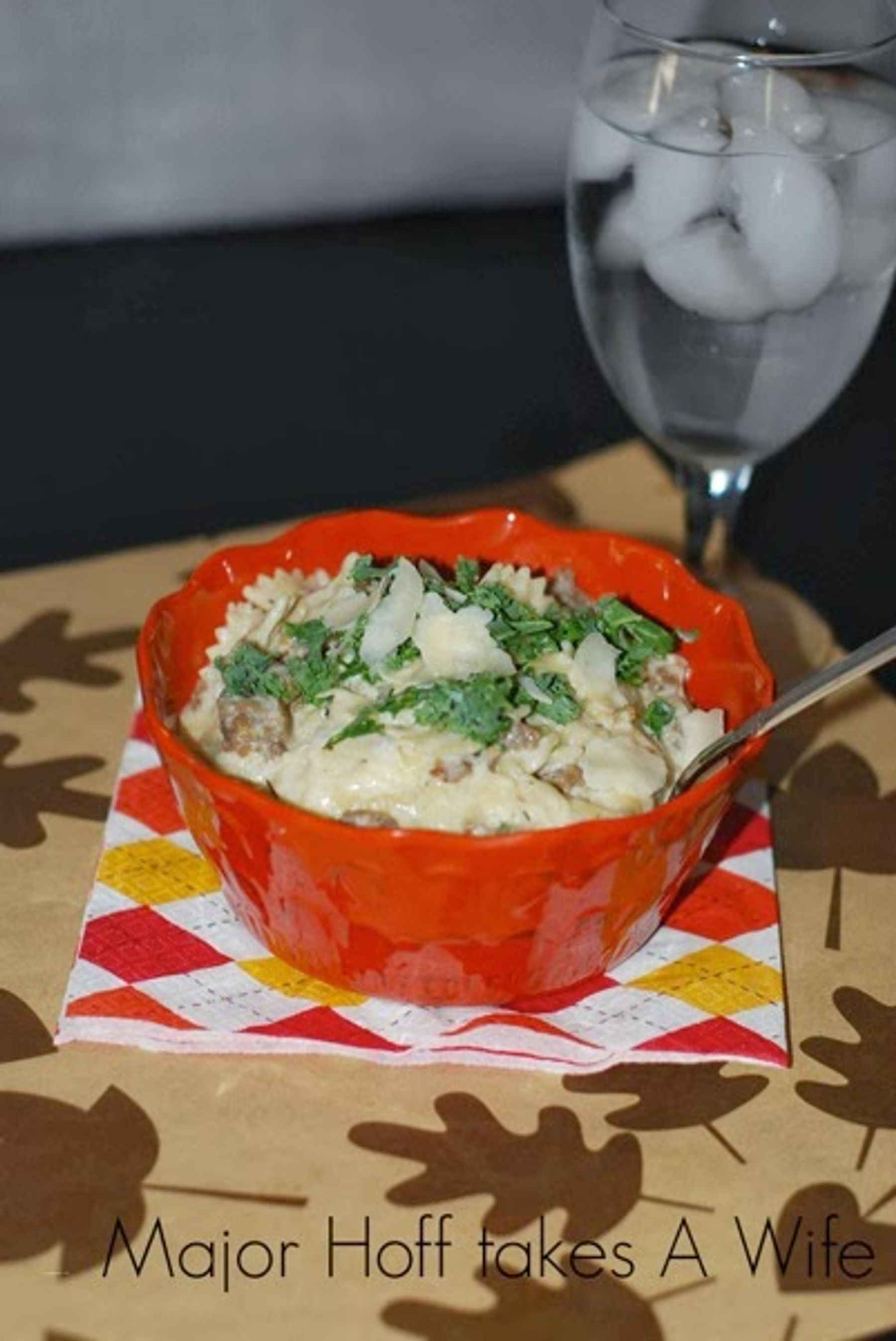 Comfort food---cheesy Italian cheese/garlic sauce coating pasta with Italian Sausage.