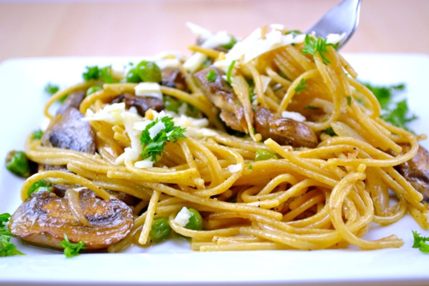 Garlic Butter Spaghetti With Roasted Mushrooms and Peas