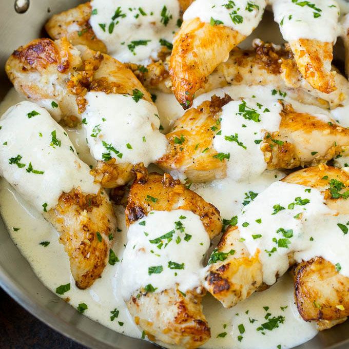 This garlic chicken is chicken breast tenders with plenty of fresh minced garlic in a creamy parmesan sauce. A quick and easy meal that tastes like it came from a fancy restaurant!