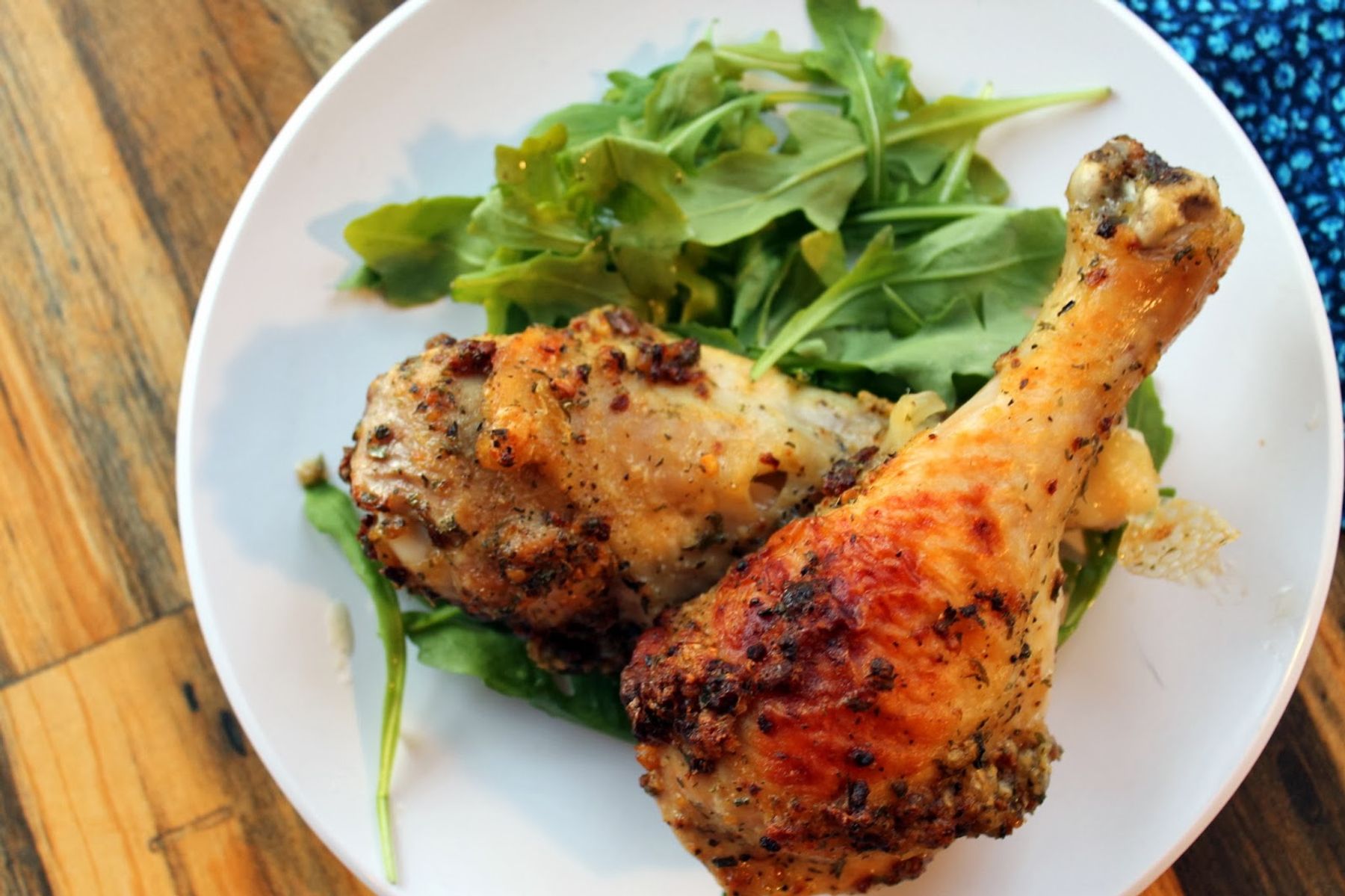In a large plastic bag (or bowl) combine garlic, oil, vinegar, and herbs mixing well to combine. Add chicken and toss to coat. Seal and refrigerate for at least 2 hours or as long as over night. Preheat...