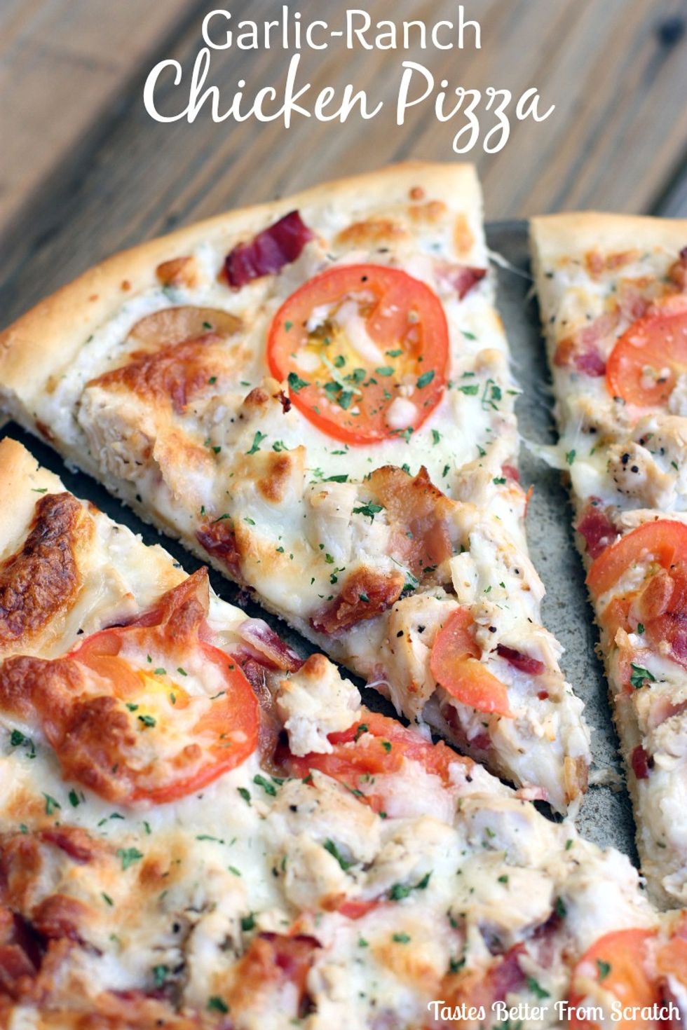 Mix all ingredients together for the garlic-ranch sauce. Spread mixture over the top of the pizza dough. Sprinkle 1 cup of the mozzarella cheese over top, followed by the chicken, bacon, and tomatoes....