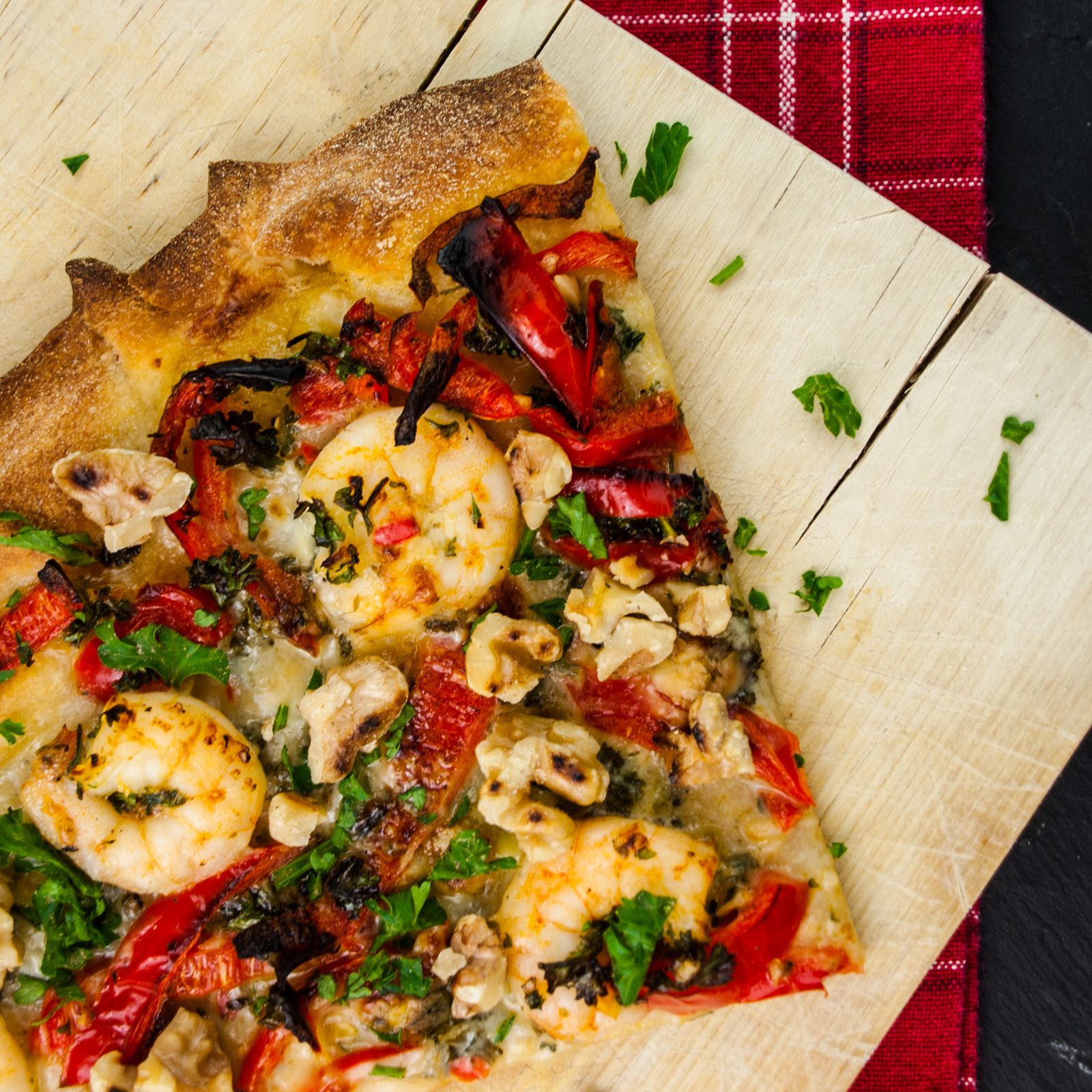 Crunchy pizza with garlic butter shrimp, blue cheese, sweet bell peppers and walnuts