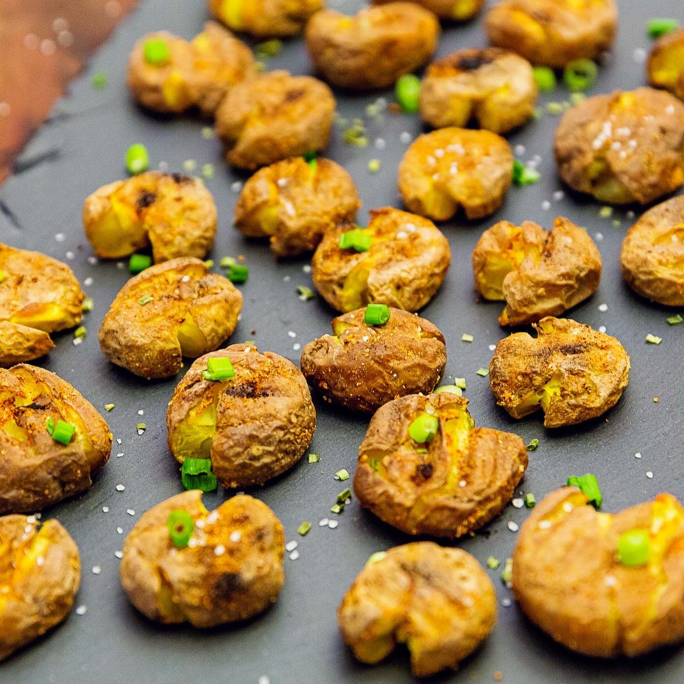 Garlic Smashed Baby Potatoes are so easy and yummy! Perfect as an appetizer or side dish. Vegan, oil free, and gluten free!