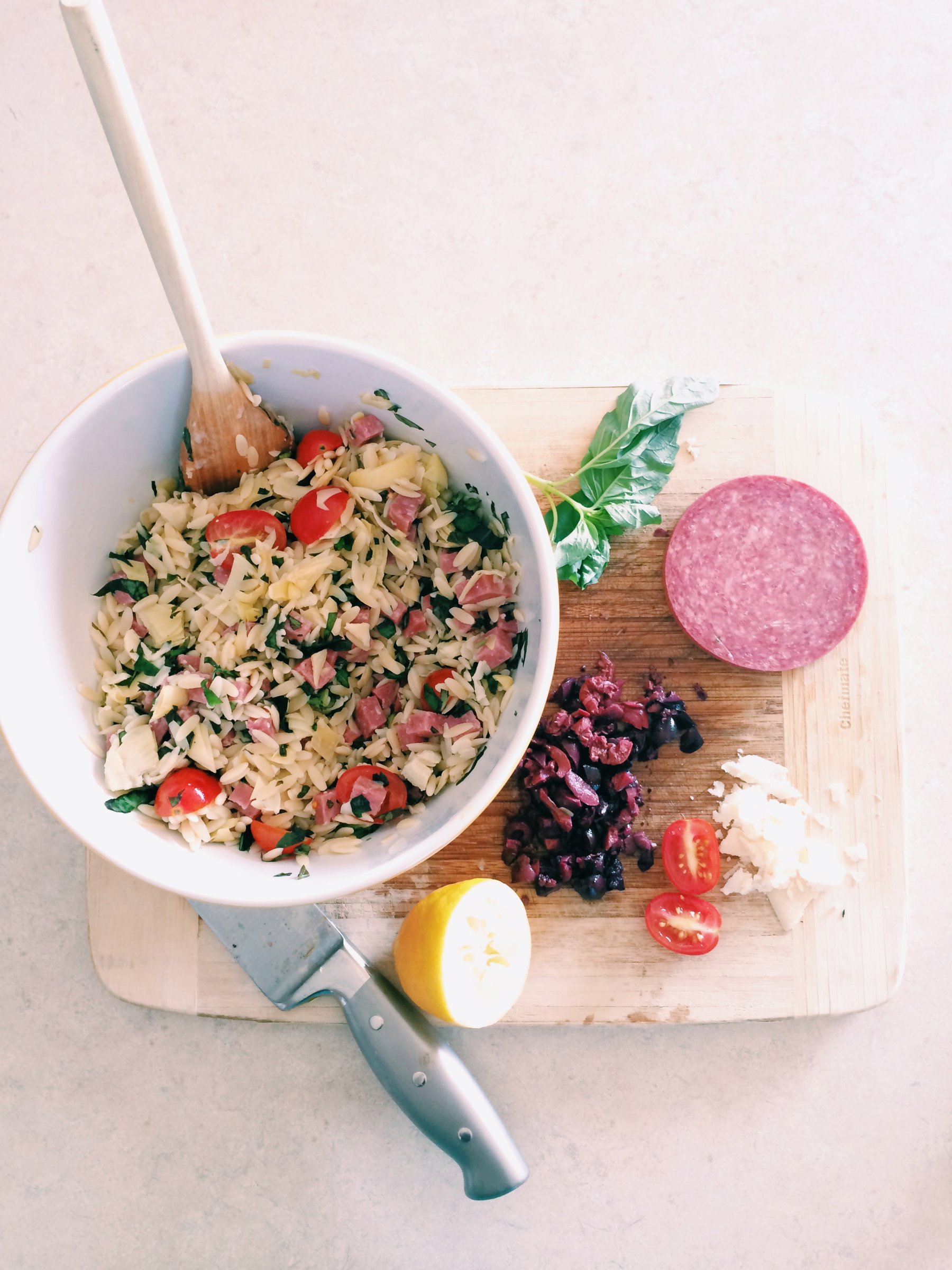 If you'd like to serve this dish warm, add the genoa salami, basil, olives, artichoke hearts and tomatoes to the bowl and toss all of the ingredients...