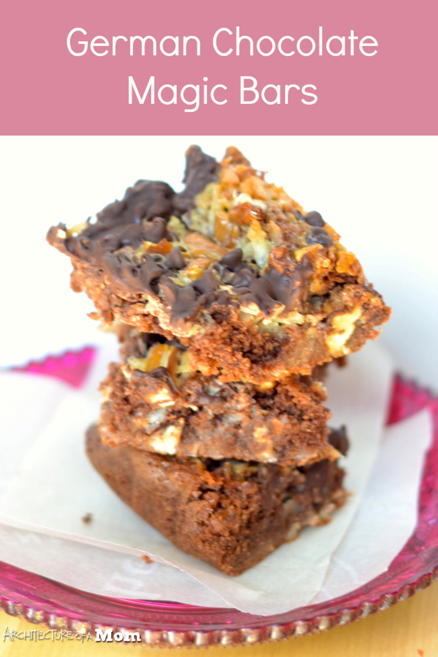 I love the combination of chocolate and coconut, as was first shared here with my Mounds Granola, Samoa Brownies, and several other recipes. Which is why I love German Chocolate...well, German chocolate anything. These German Chocolate Magic Bars are easy and yet a rich gooey way to get your recommended daily allowance of chocolate, coconut, and nuts--a well balanced dessert, if you ask me!