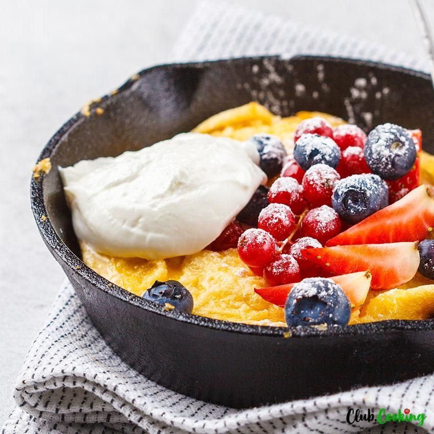 German pancakes are in fact one huge pancake, baked in a sheet cake pan. It's a great alternative to a pile of pancakes which takes a lot of baking time.