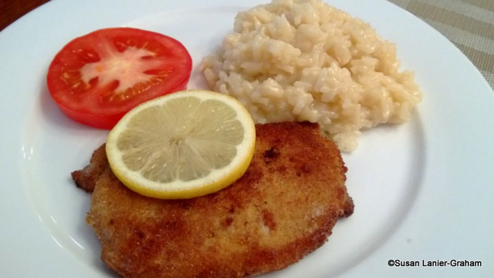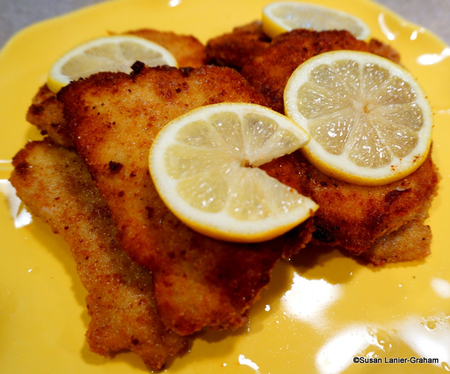 Breaded and sauteed pork cutlets, served with fresh lemon slices. This is a traditional German recipe I've made for three decades.