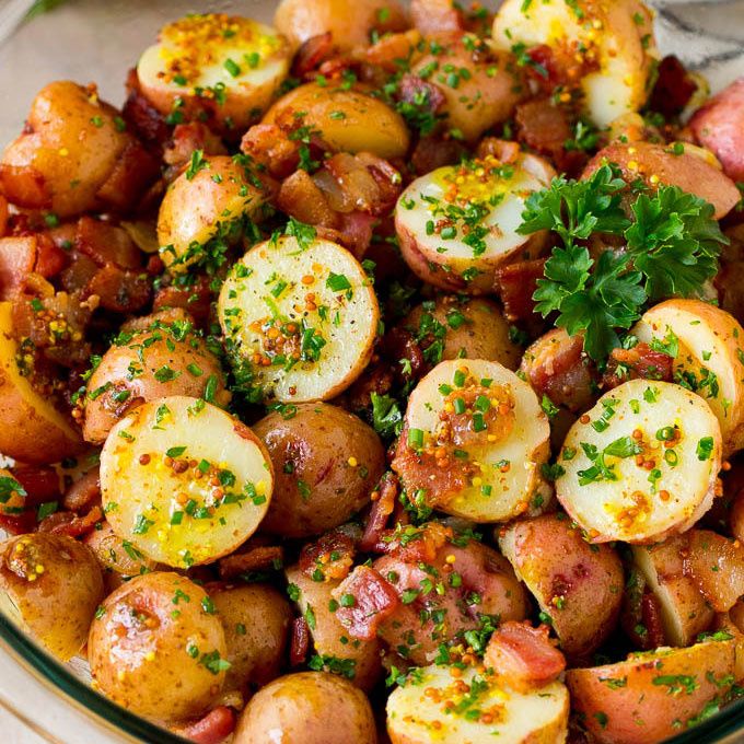 This German potato salad is boiled baby potatoes tossed in a warm bacon and mustard dressing, then garnished with fresh herbs. A unique, mayonnaise free salad that's great for parties and potlucks.