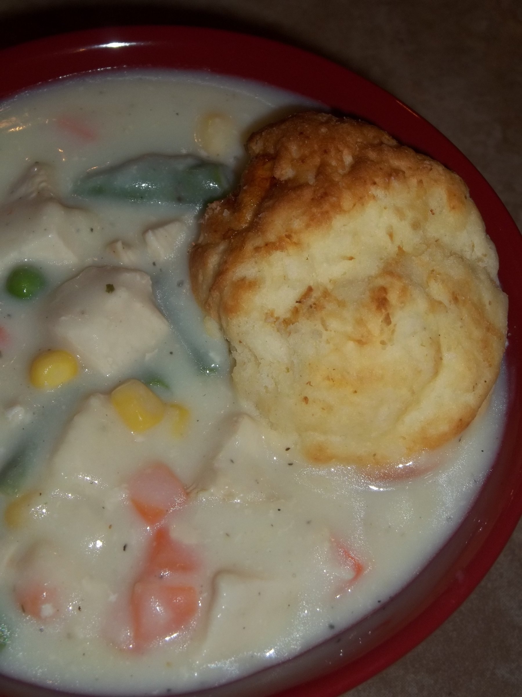 I have always loved Chicken Potpie, but it is usually a very time consuming thing to make! This recipe by no means replaces a good Chicken Potpie, but it definitely helps to curb the craving! It's comes together in a matter of minutes, and it's the perfect comfort food! Warm, creamy and just good! We like to serve it with biscuits, but you could also use rolls or even toast! I hope you try it out!
