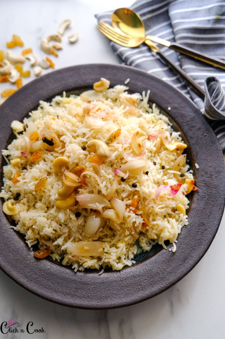 Ghee Rice (Nei Choru) Nithya27October 09, 2020 66 This Ghee rice recipe is extremely flavourful, the rice is so fluffy, can be made with minimal ingredients, about to become your new family favourite and on your table under 20 mins or less than that.3Please Check:- https://www.nithisclickncook.com/ghee-rice/See the full directions on my site