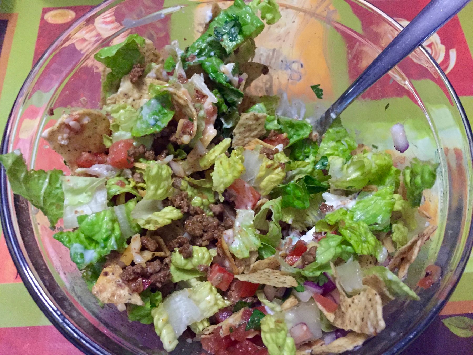 Add seasoned beef, lettuce, peppers, shredded cheese, chips, salsa, sour cream and pico in a bowl...