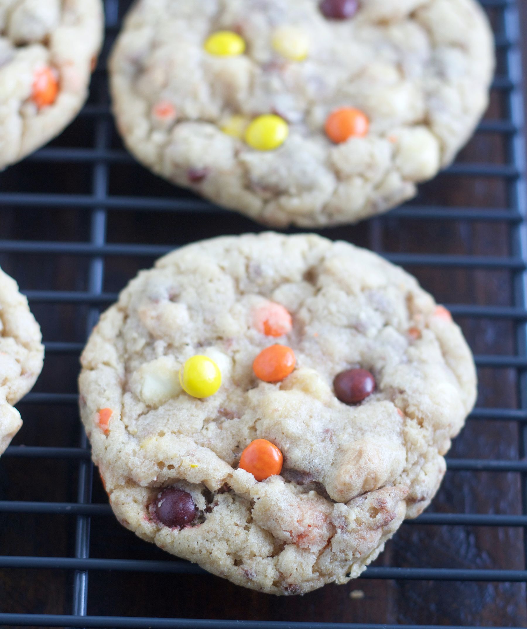 Girlfriend Cookies loaded with ground oats, milk chocolate chunks, Mini Reese’s Pieces, white chocolate and peanut butter chips. They are pretty darn good and could possibly be the perfect girlfriend bait.