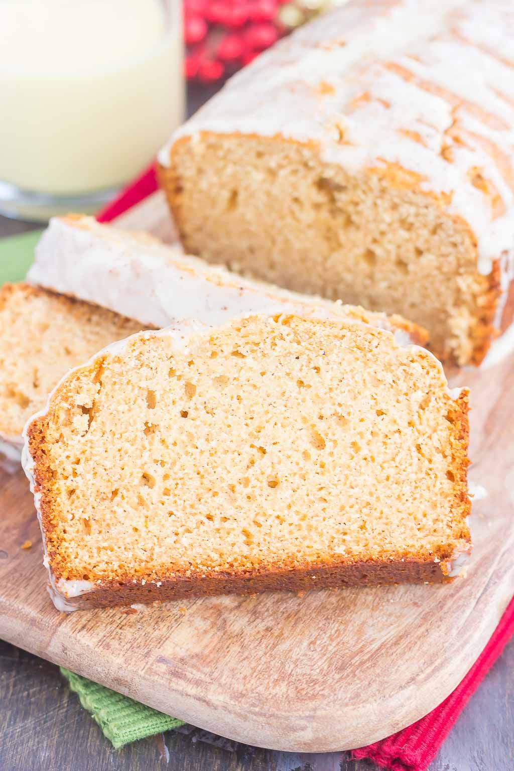 Breads Glazed Eggnog Bread Gayle BDecember 11, 2017 70 This Glazed Eggnog Bread is filled with warm holiday spices and makes a deliciously festive treat!https://www.pumpkinnspice.com/glazed-eggnog-bread/See the full directions on my site