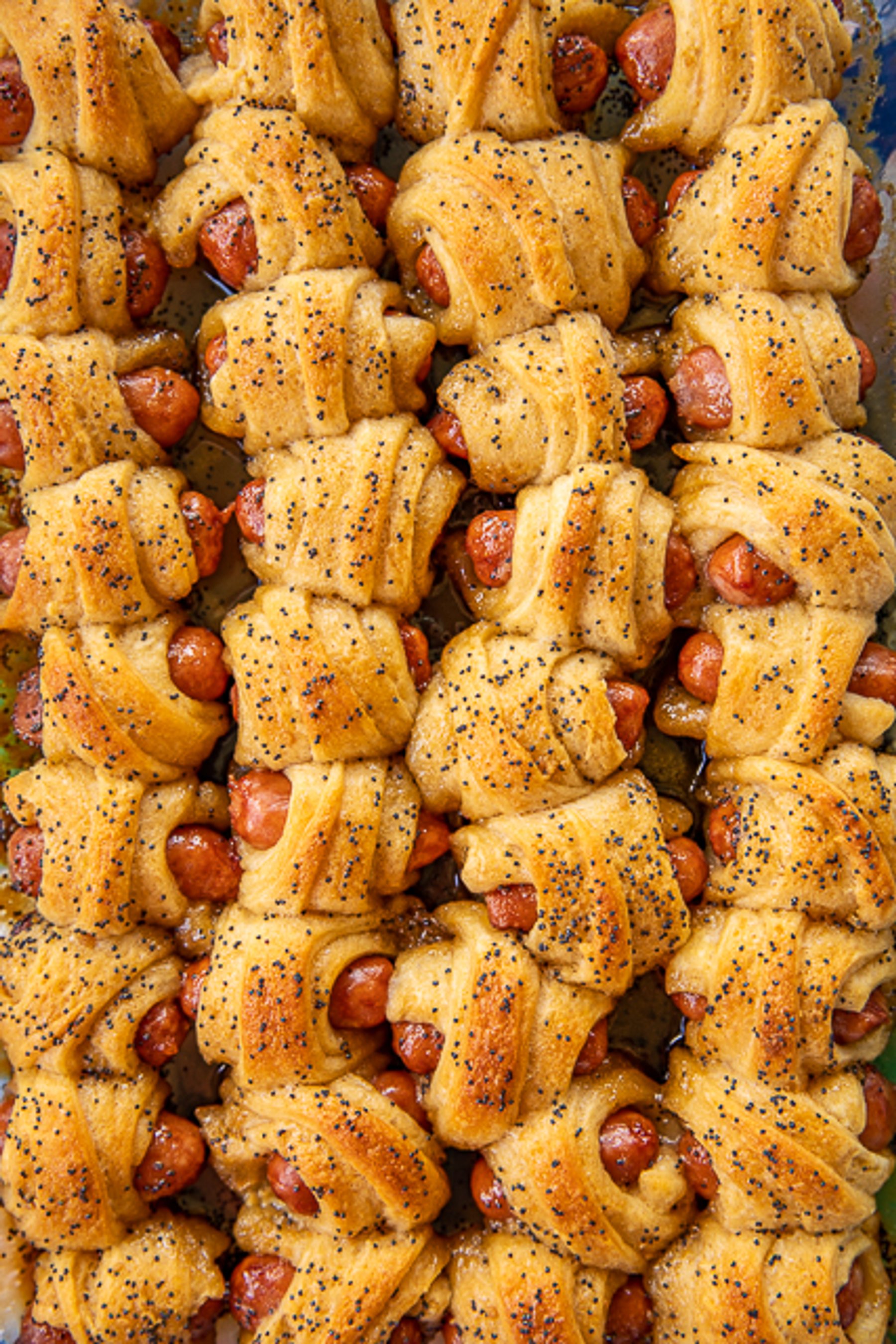 Glazed Pigs in a Blanket - pigs in a blanket baked in a sweet and savory brown sugar glaze. Took these to a party and they were gone in minutes!!! Crescent rolls, dijon mustard, little smokies, brown sugar, butter, poppy seeds and Worcestershire sauce. I have zero self-control around these things! Dangerously delicious!! A MUST for all your tailgates and parties! #tailgating #Pigsinablanket #partyfood #appetizer