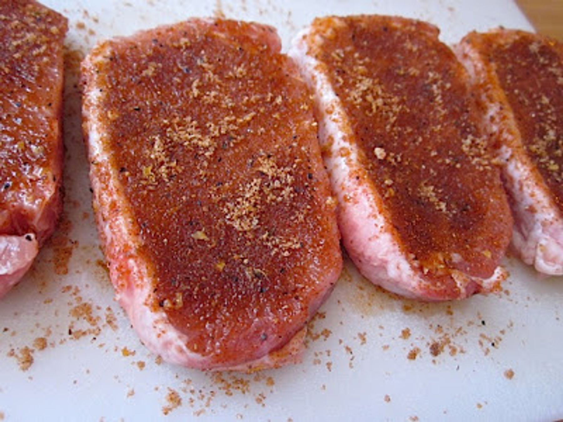 Remove the pork chops from their package and rub the brown sugar/spice mix all over both sides.