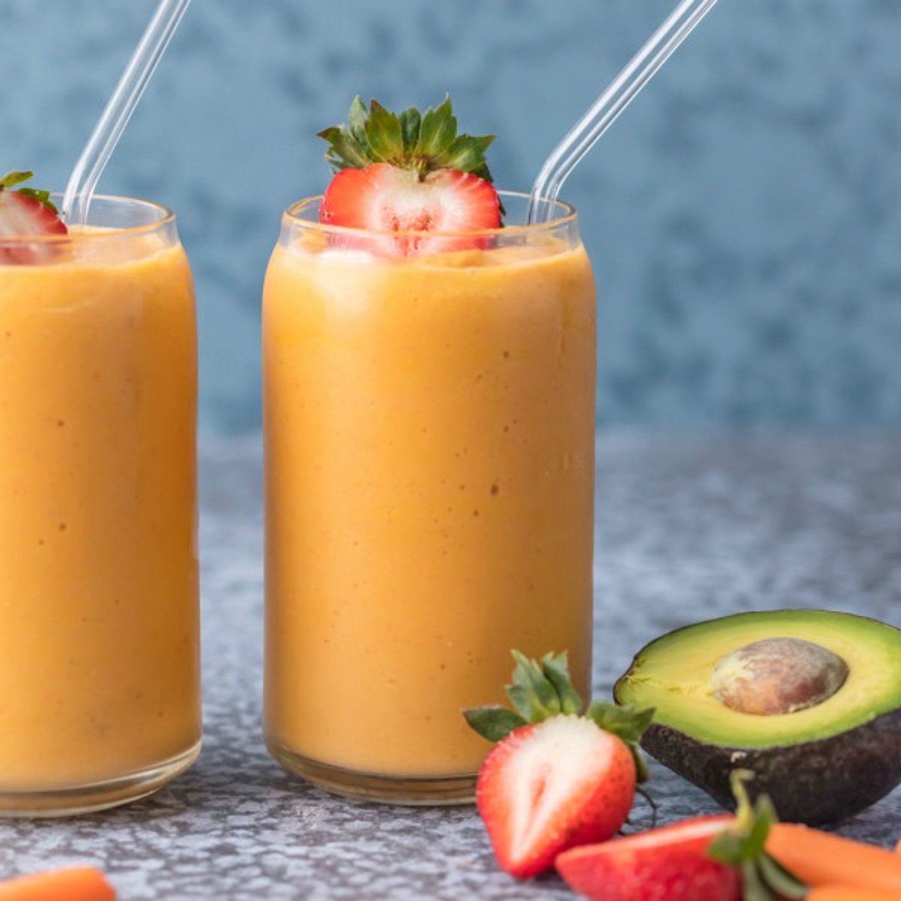 This GLOWING SKIN SMOOTHIE is full of delicious ingredients like coconut water, strawberries, mangoes, carrots, and avocado! Sip your way to beautiful skin with this easy treat.