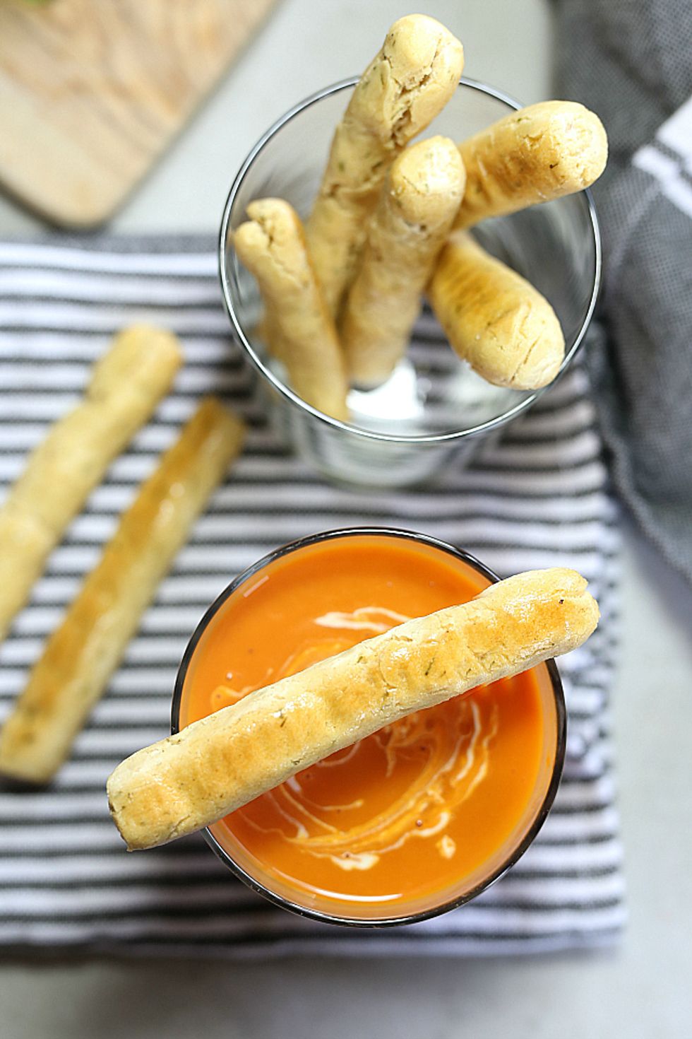 Crunchy and satisfying gluten free breadsticks recipe that is low in carbs and bold in flavor! Savory herbs make each bread stick perfect for dipping in soups and healthy dips!