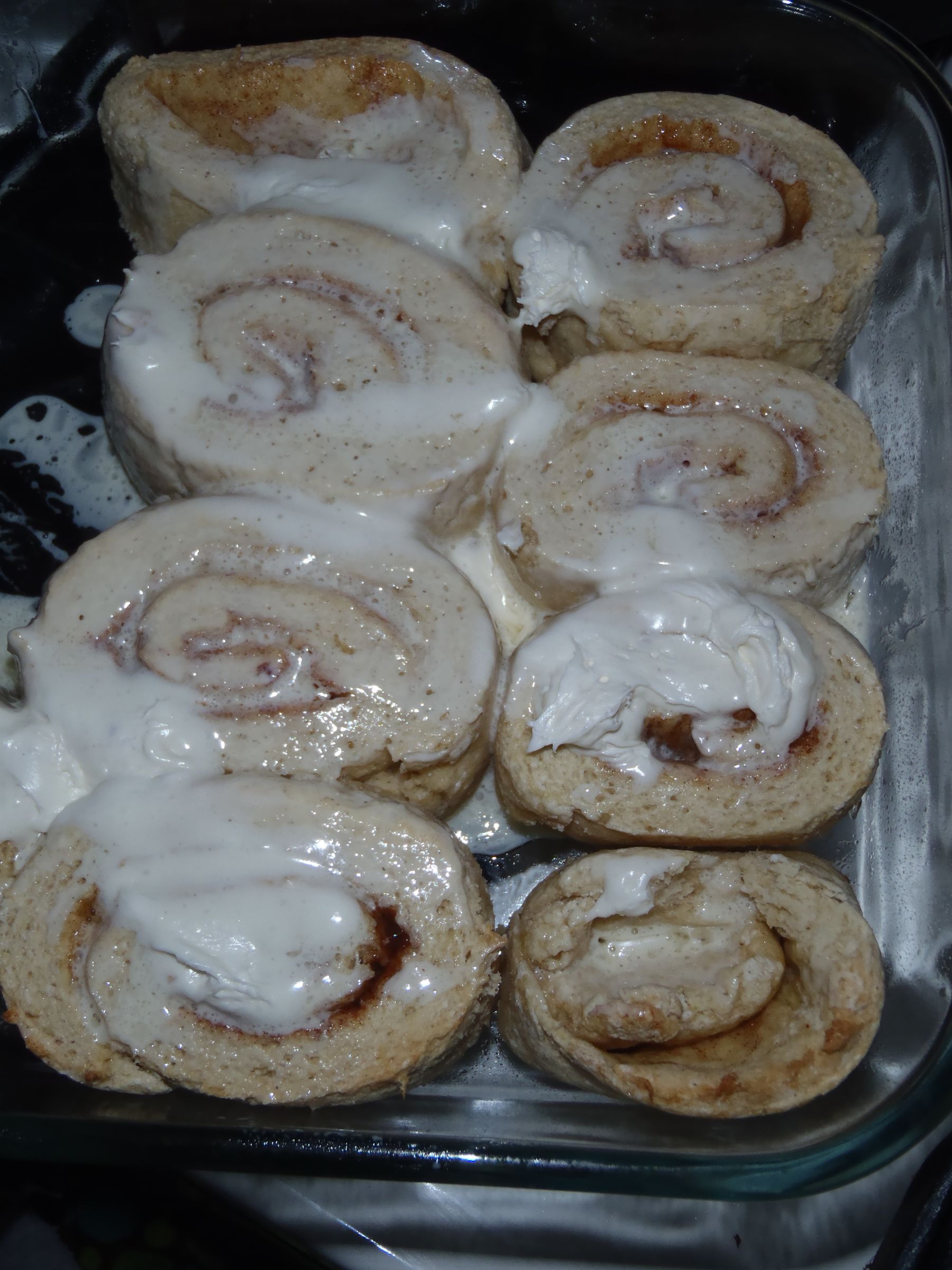 Put pizza mix and cake mix in bowl. Take yeast packet from pizza mix and dump it into a bowl. Add water to yeast and let sit. Add eggs to mixture before you mix it together with mixes. Mix all together. Once mixed together roll out dough. Sprinkle brown sugar and cinnamon on the dough. Spread butter over the sugar and cinnamon. Roll together like a jelly roll. Cut dough into pieces and let raise in pan for 1 1/2 hours. Once cooked spread with cream cheese frosting