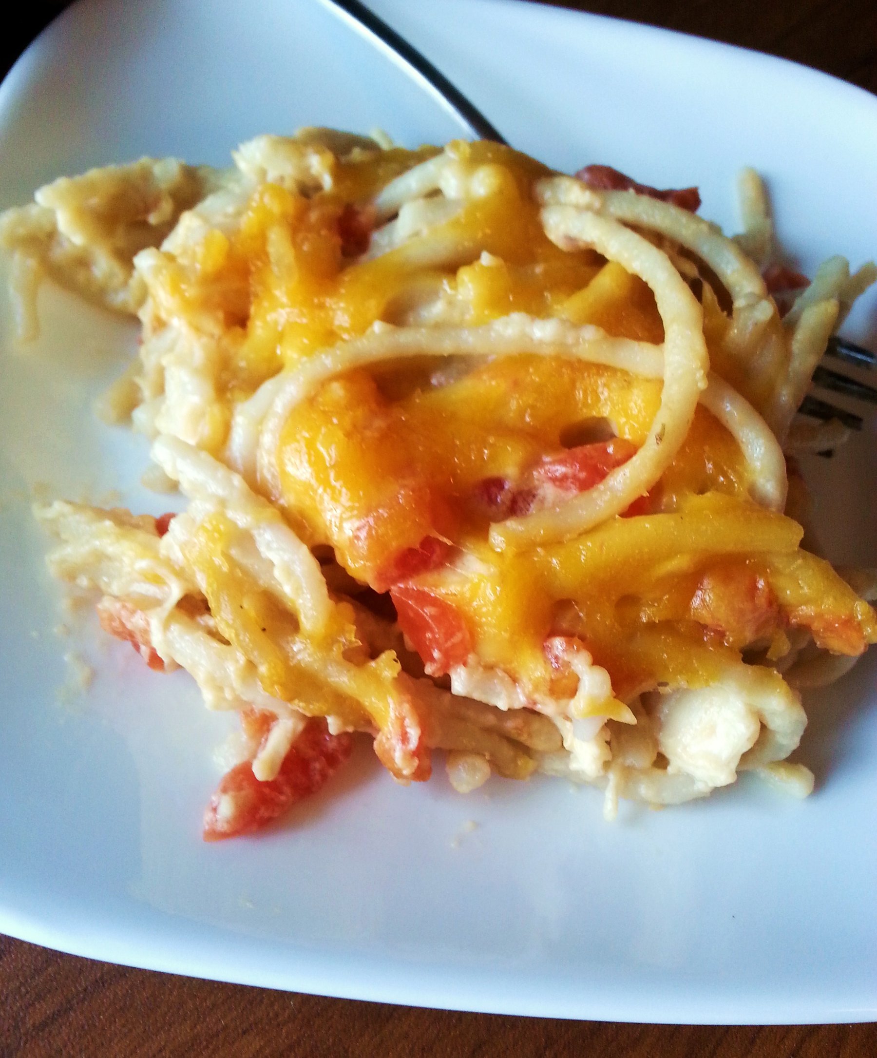 Cheese, chicken, and spaghetti! A gluten free chicken casserole after my own heart – full of flavor and no more fussy than it needs to be.