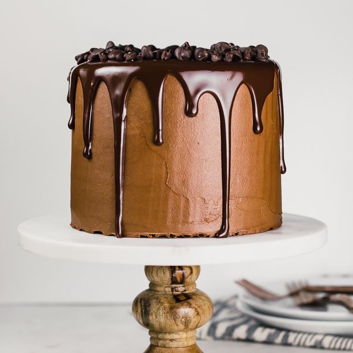 A three-layer, gluten-free chocolate cake recipe frosted with chocolate fudge frosting, topped with a dark chocolate ganache, and decorated with a ring of chocolate chips.