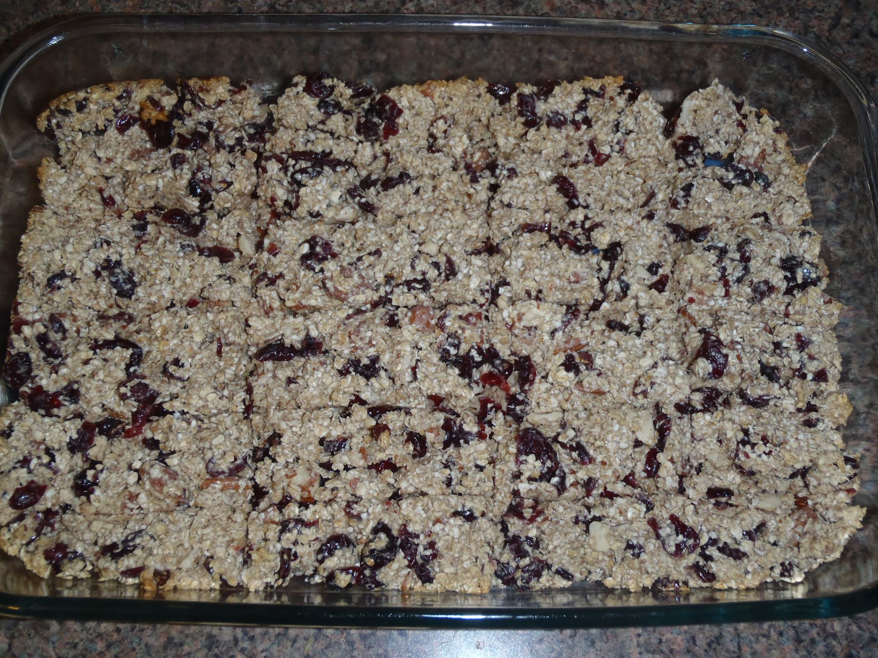 Mix it all up together and pack it into a 9 x 13 pan. Bake for about 20 min at 350 degree oven. For chewy bars remove from oven when edges brown. Let them cool for a few minutes before cutting into pieces and removing from pan.