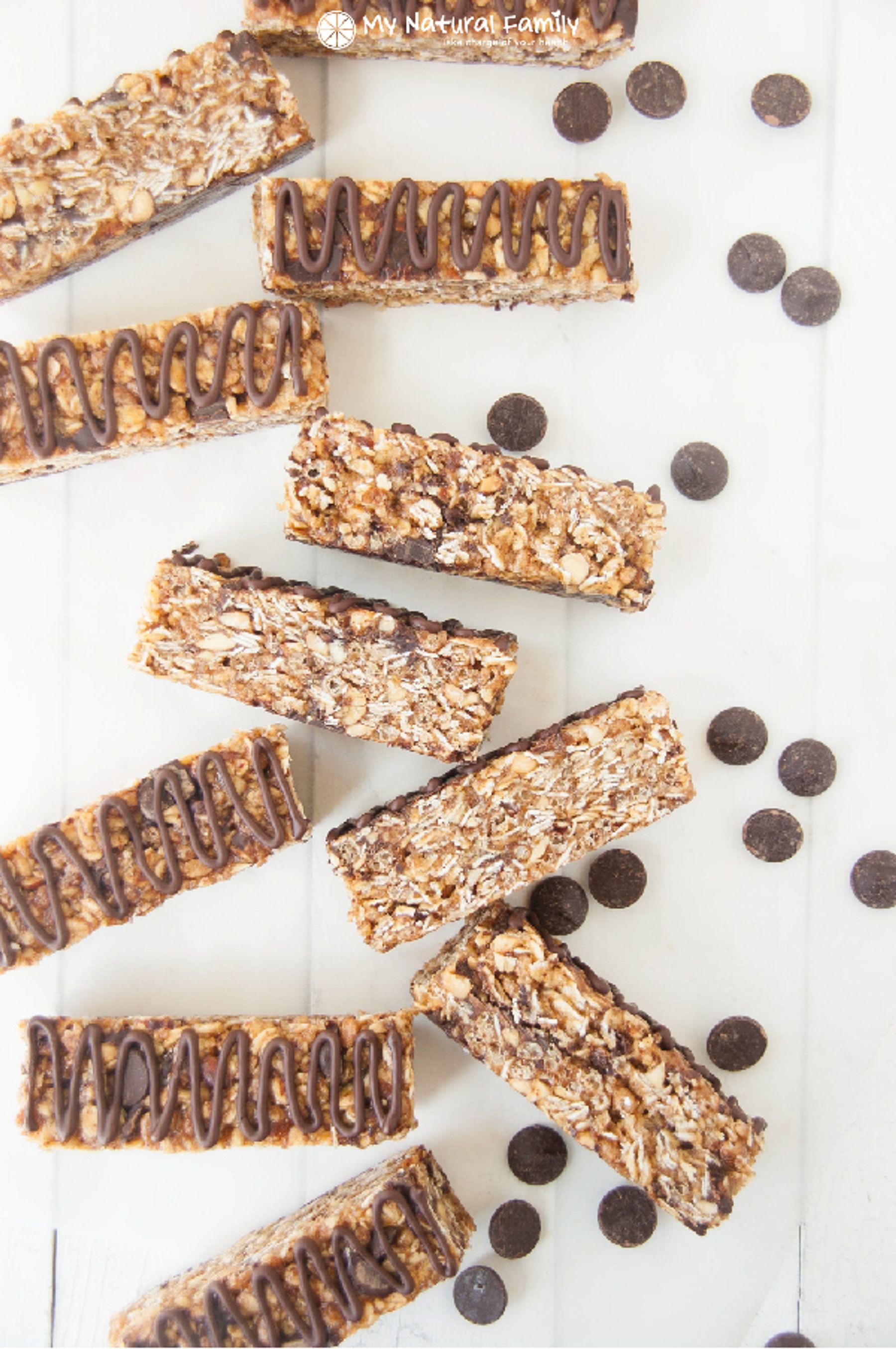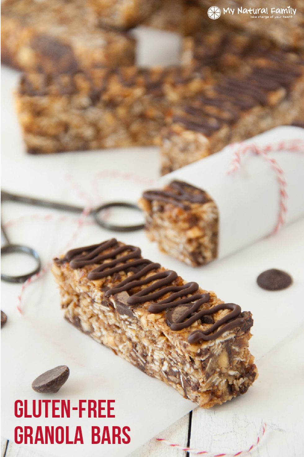 These granola bars are protein packed and taste like a cookie with almond butter and chocolate chips. Both rolled oats and rice cereal are used to add a little variety in texture.