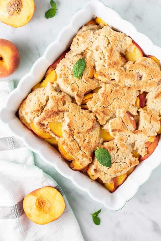 A delicious Peach Cobbler recipe made with a sweet and buttery almond flour topping. Perfect for when summer peaches are getting over ripe! Enjoy this vegan peach cobbler with vanilla ice cream, coconut sorbet, or even with yogurt for breakfast.